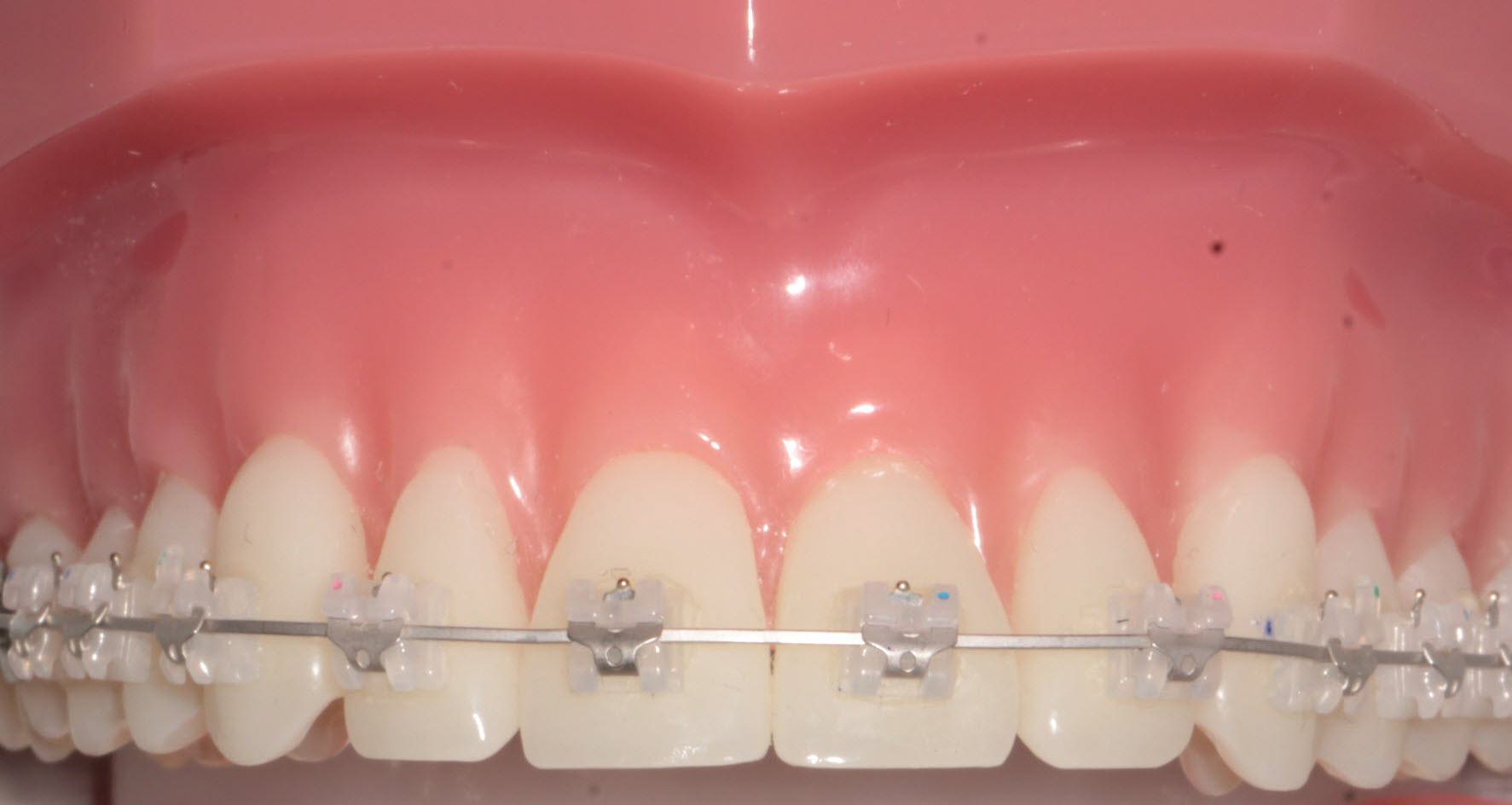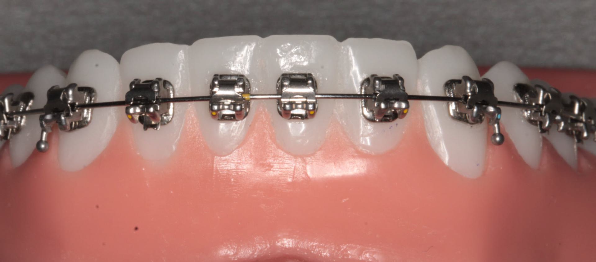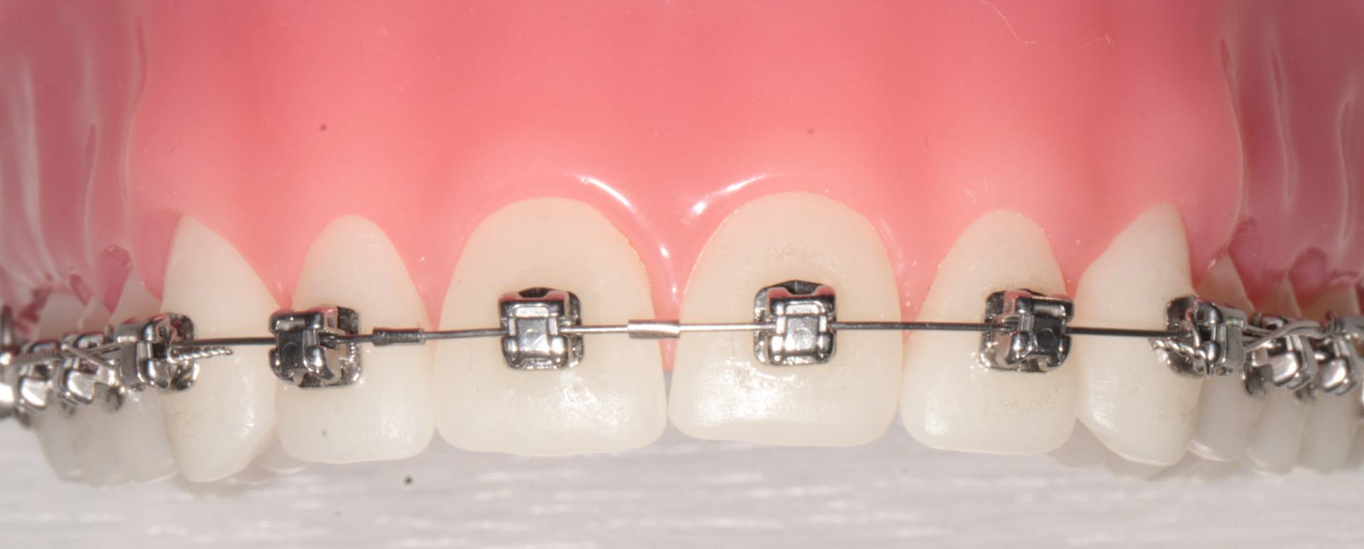 1) Konventionelle Brackets, bei welchen man den Bogen mit Hilfe eines Gummis im Bracketschlitz befestigt. Durch dieses „Hineindrücken“ erhöht sich allerdings der Widerstand, den der Zahn einer Bewegung am Bogen entlang entgegensetzt. Daraus ergibt sich oft eine längere Behandlungszeit.